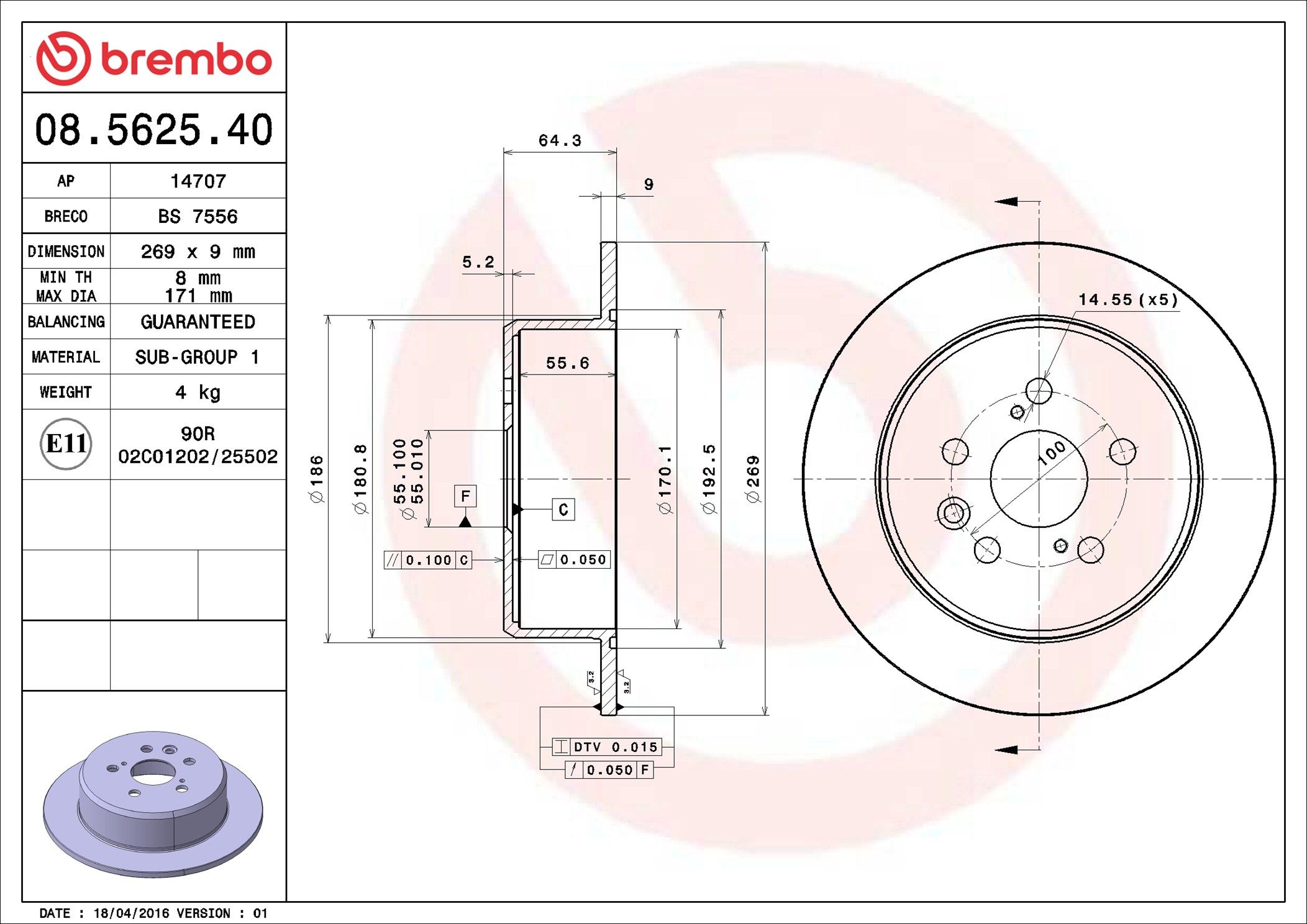 BREMBO 08.5625.40 | Fren Diski Arka Standard Toyota | 2 Adet