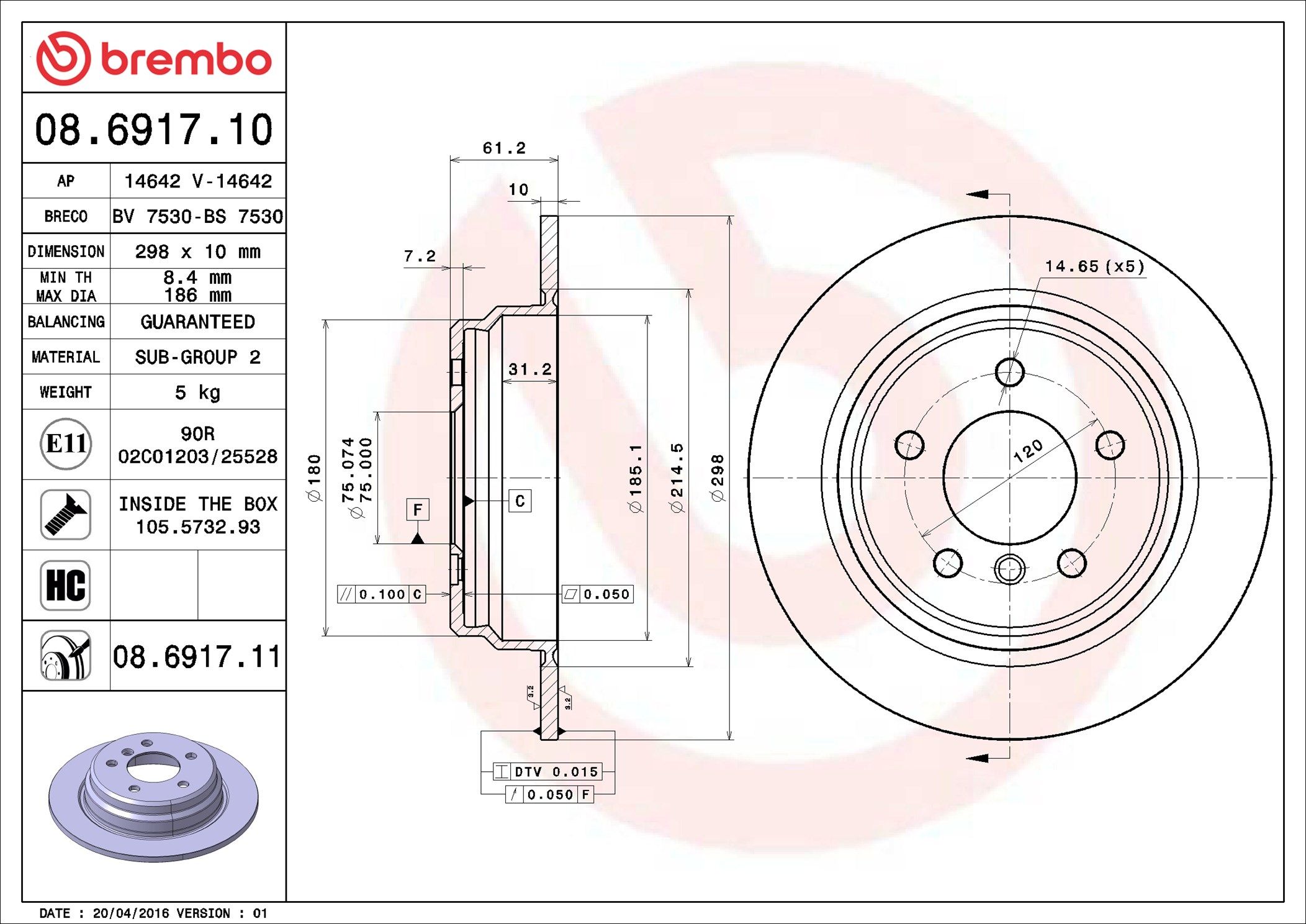 BREMBO 08.6917.11 | Fren Diski Arka Düz (BMW Series 5 E39 520I 96-03) Kaplamalı | 2 Adet (Fren diski)