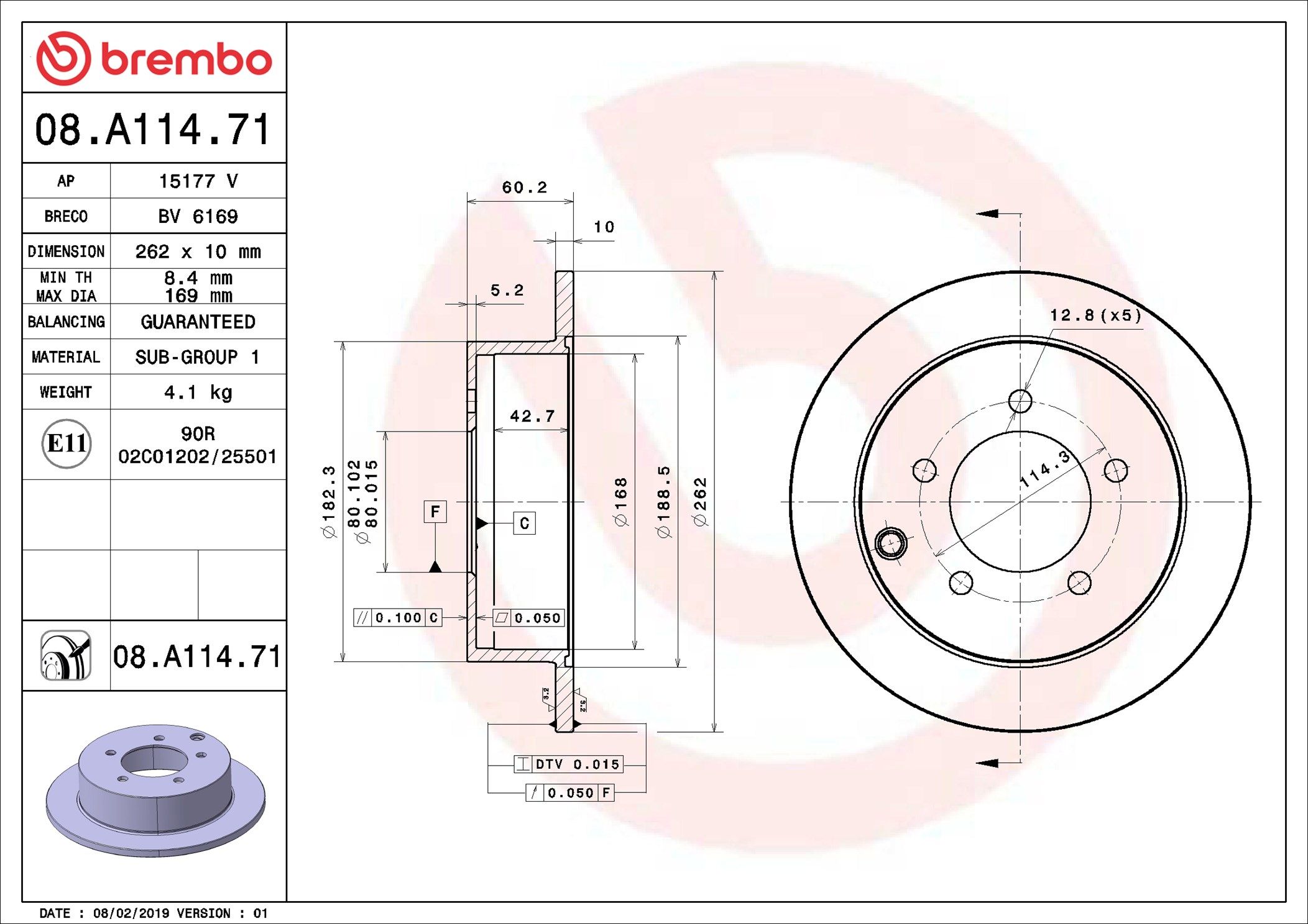 BREMBO 08.A114.71 | Fren Diski Arka Düz-(262-5)-(Mitsubishi Lancer 08 / 12 1.5-1.6-1.8) UV Coated | 2 Adet Takım
