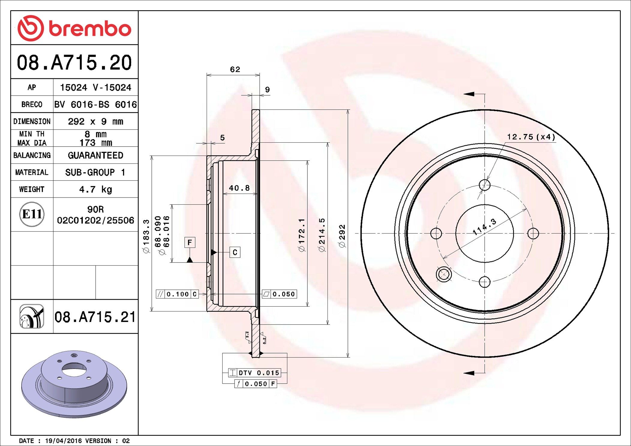 BREMBO 08.A715.20 | Fren Diski Arka (292-4) Nissan Cube 09-/ Tıda 1.6 1.8 1.5 DCI 07-12
