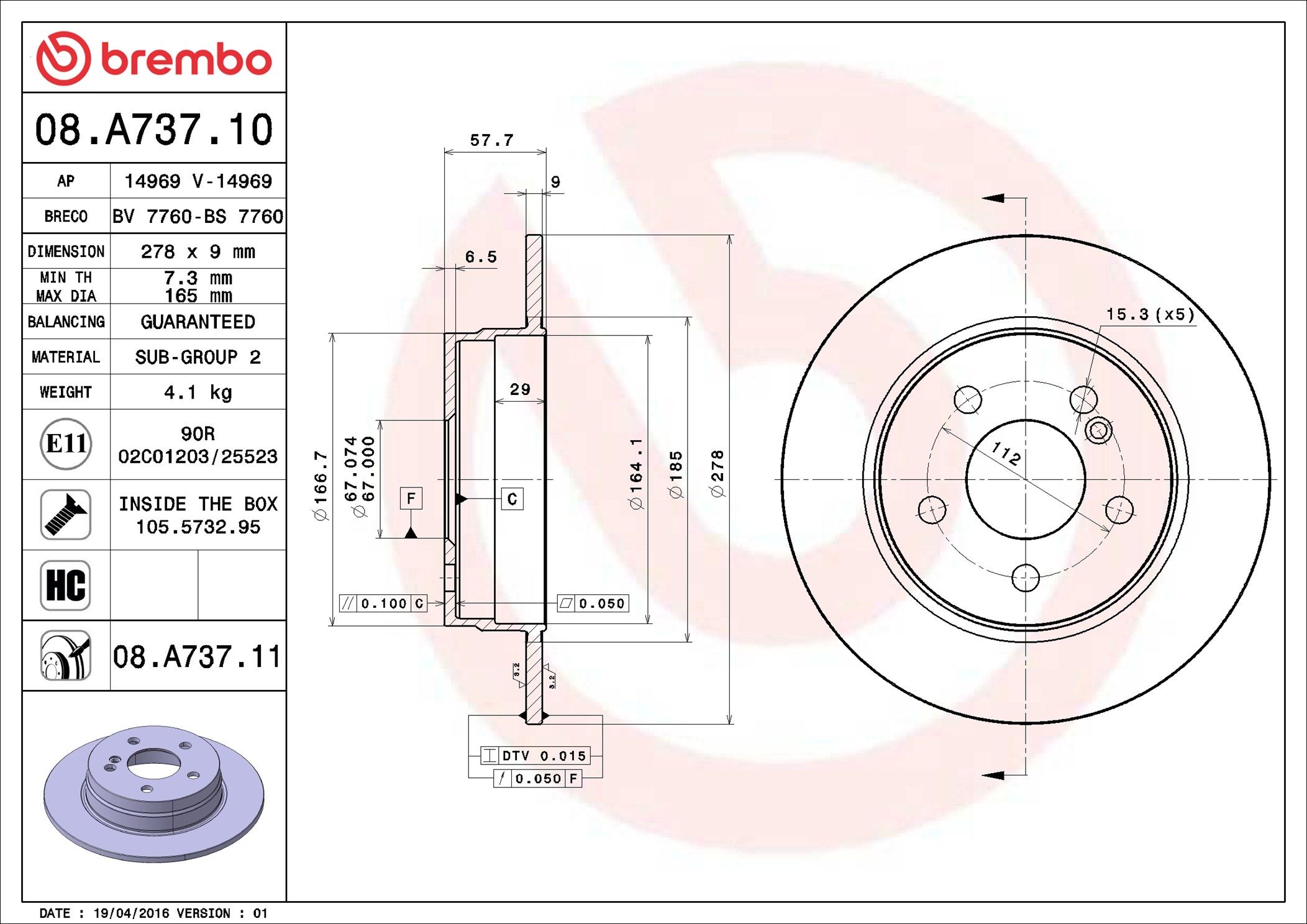BREMBO 08.A737.11 | Fren Diski Arka Kaplamalı (Mercedes W204 C180-C200) | 2 Adet (Fren diski)