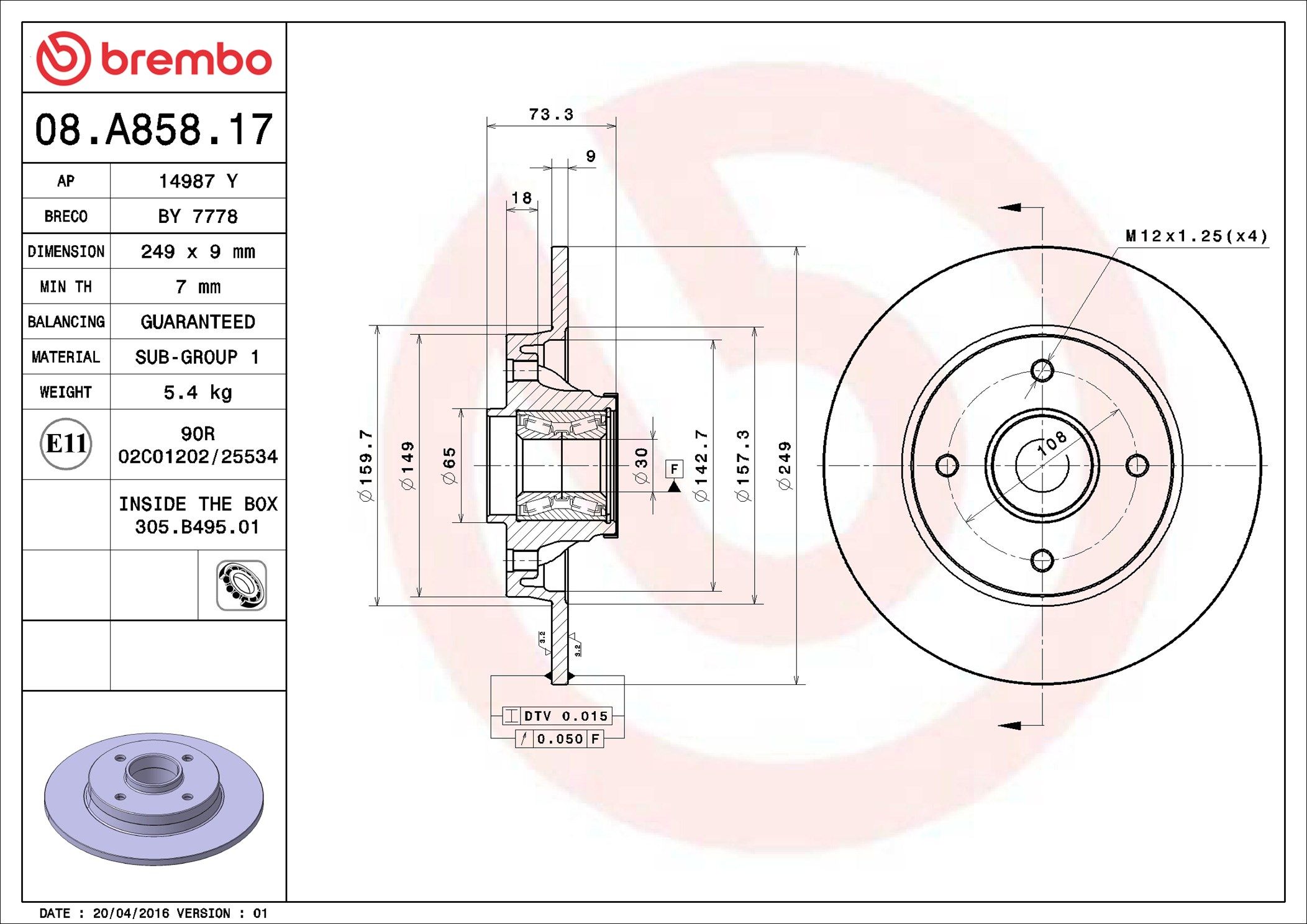 BREMBO 08.A858.17 | Fren Diski Arka Rulmanlı (Peugeot 308 1.4 1.6 HDI 2.0 HDI 07 -) | 2 Adet Takım