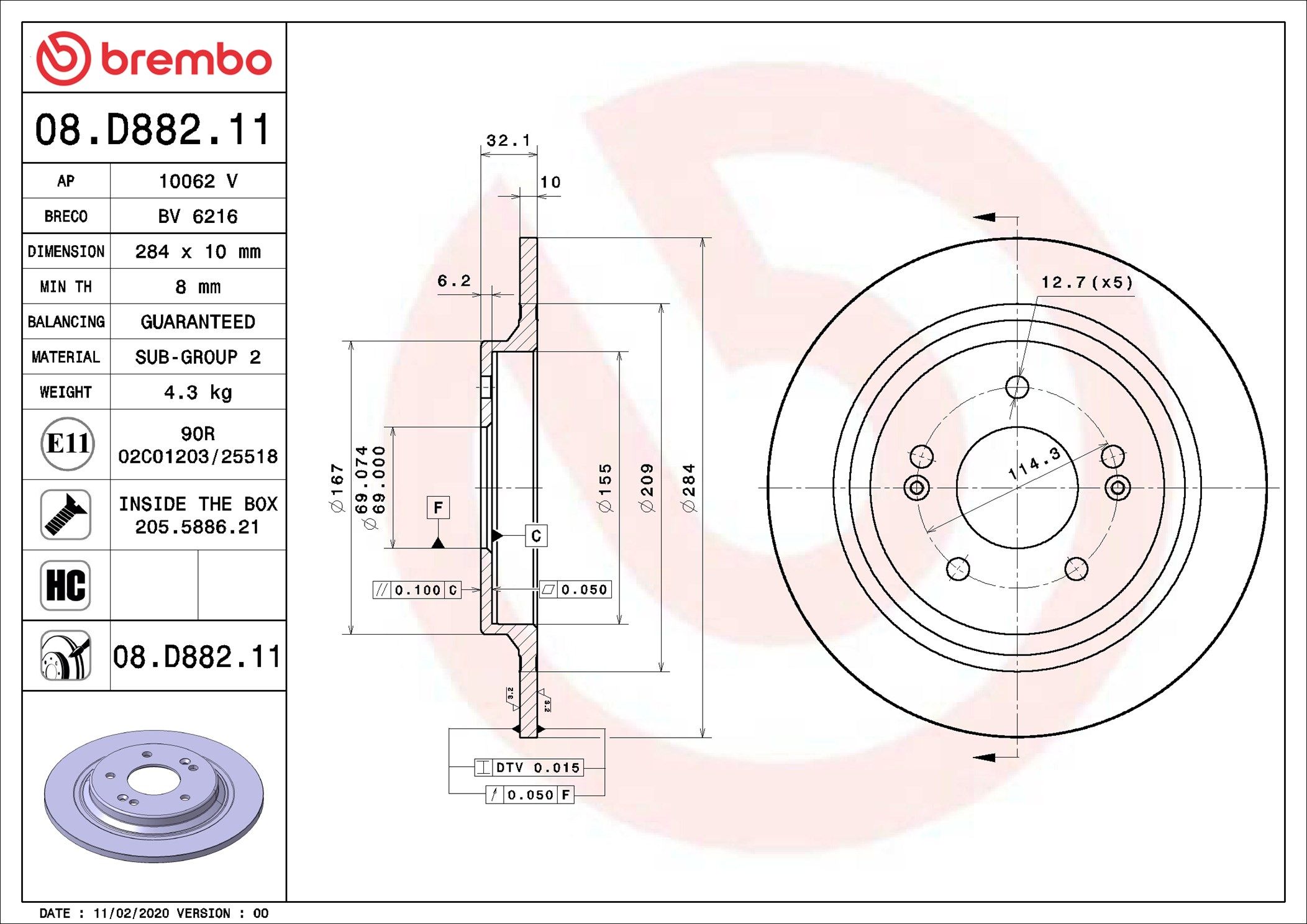 BREMBO 08.D882.11 | Fren Diski Arka Hyundai Kona 2017-/ 284×5 | 2 Adet (Fren diski)