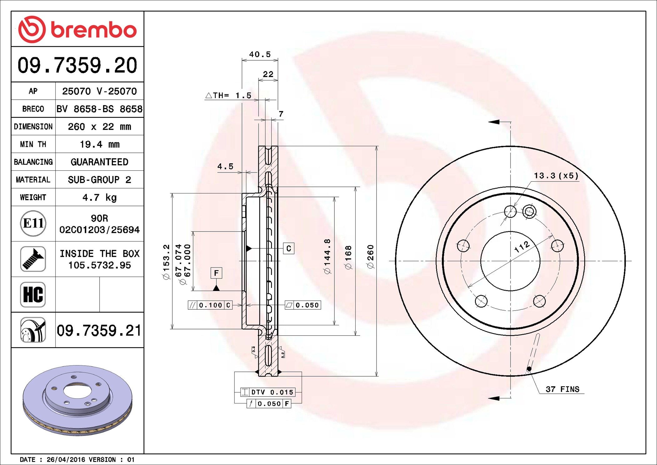 BREMBO 09.7359.21 | Fren Diski Ön W168 | 1 Adet (Fren diski)