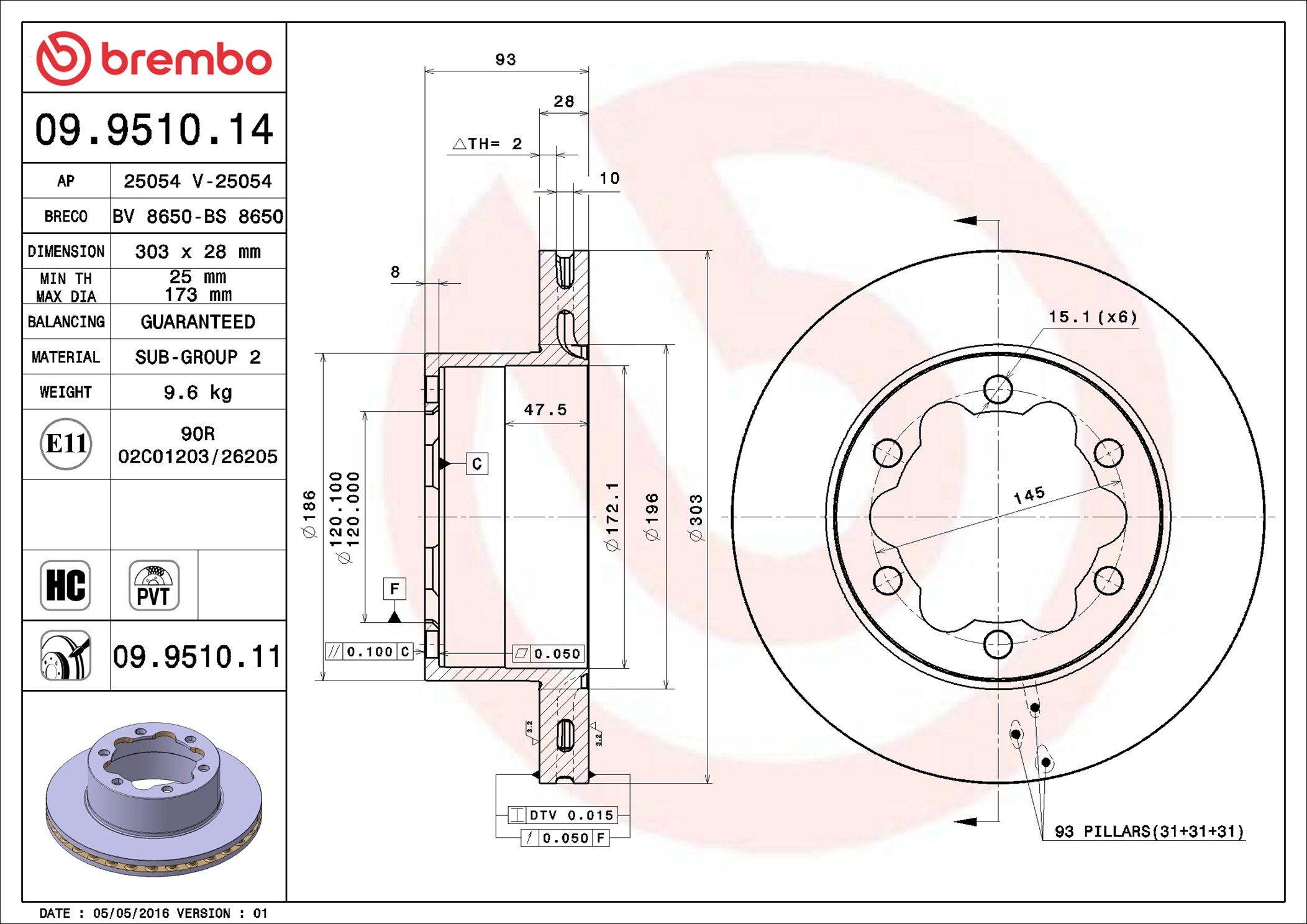 BREMBO 09.9510.11 | Fren Diski Arka UV Coated Mercedes-Benz | 2 Adet