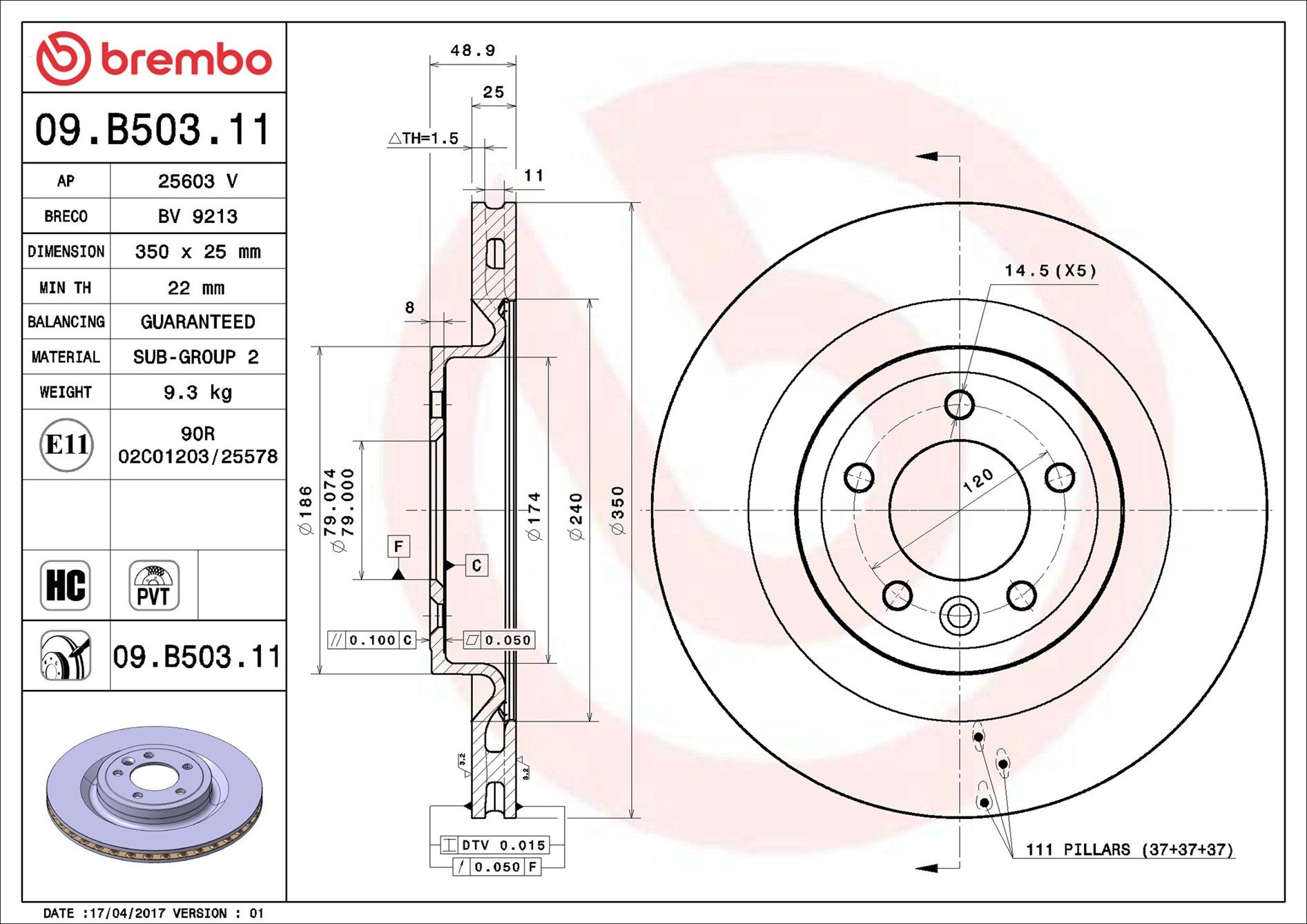 BREMBO 09.B503.11 | Arka Fren Diski. Range Sport-Vogue-Discovery 4 | 1 Adet