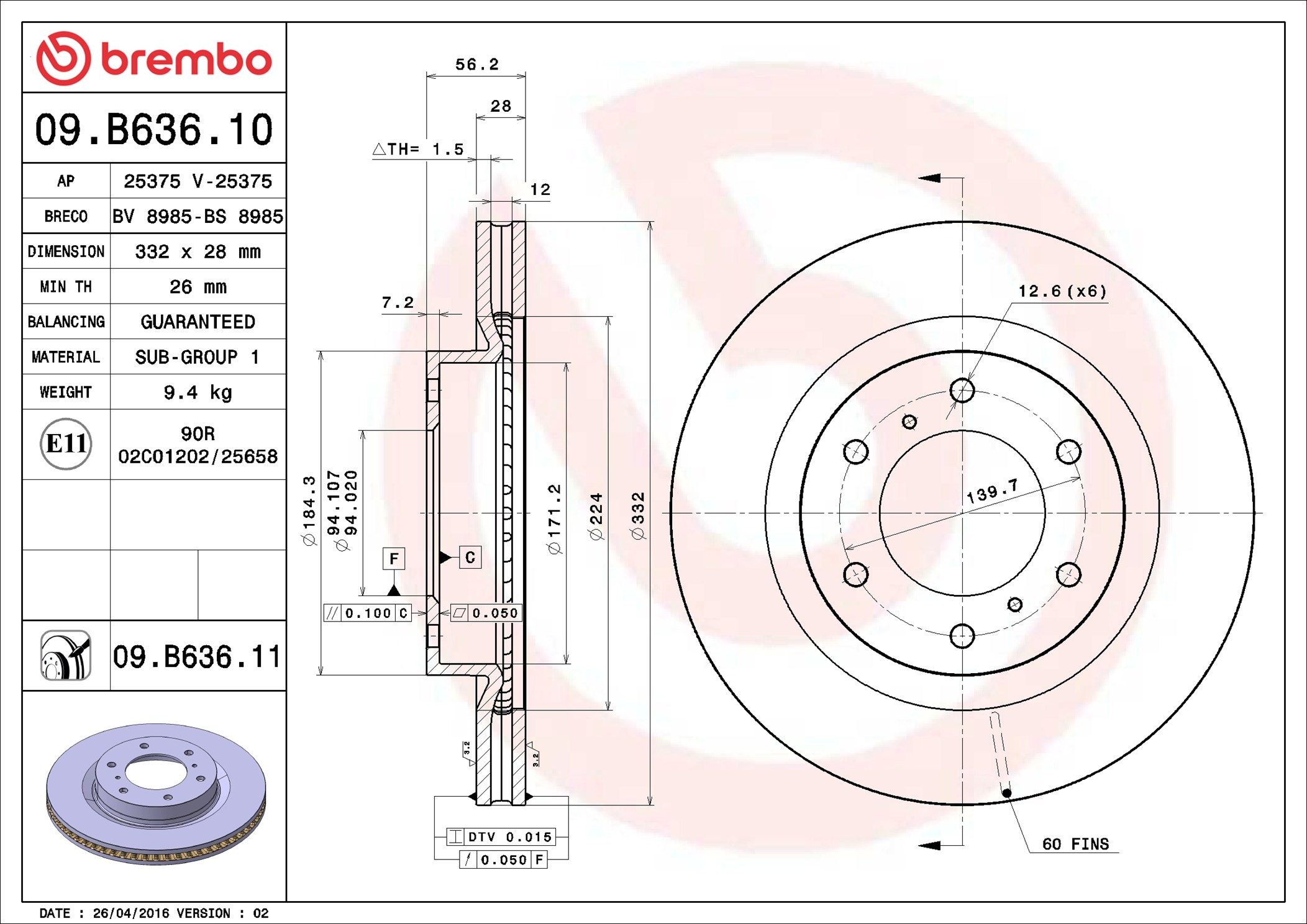 BREMBO 09.B636.11 | Fren Diski Ön Havalı-(332-6)-(Pajero 2007 / 3.2 Dıd-3,8 V6) | 2 Adet