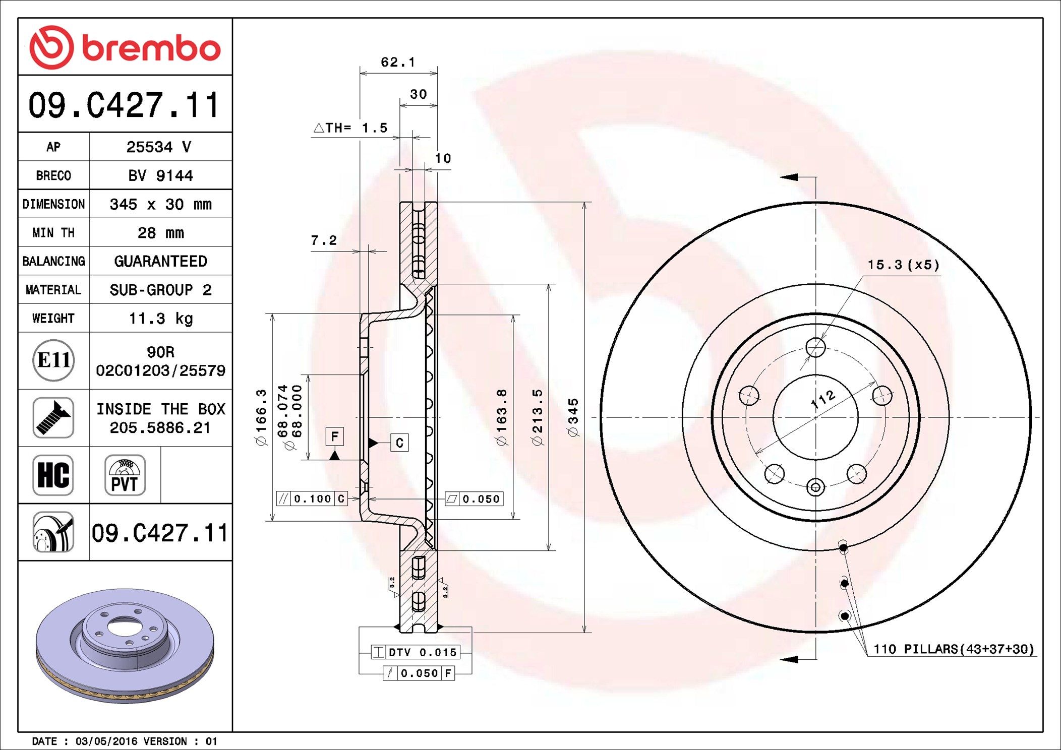 BREMBO 09.C427.11 | Fren Diski Ön Kaplamalı (Audi A6 2.0 TFSI 3.0 TDI 12-18) | 1 Adet (Fren diski)