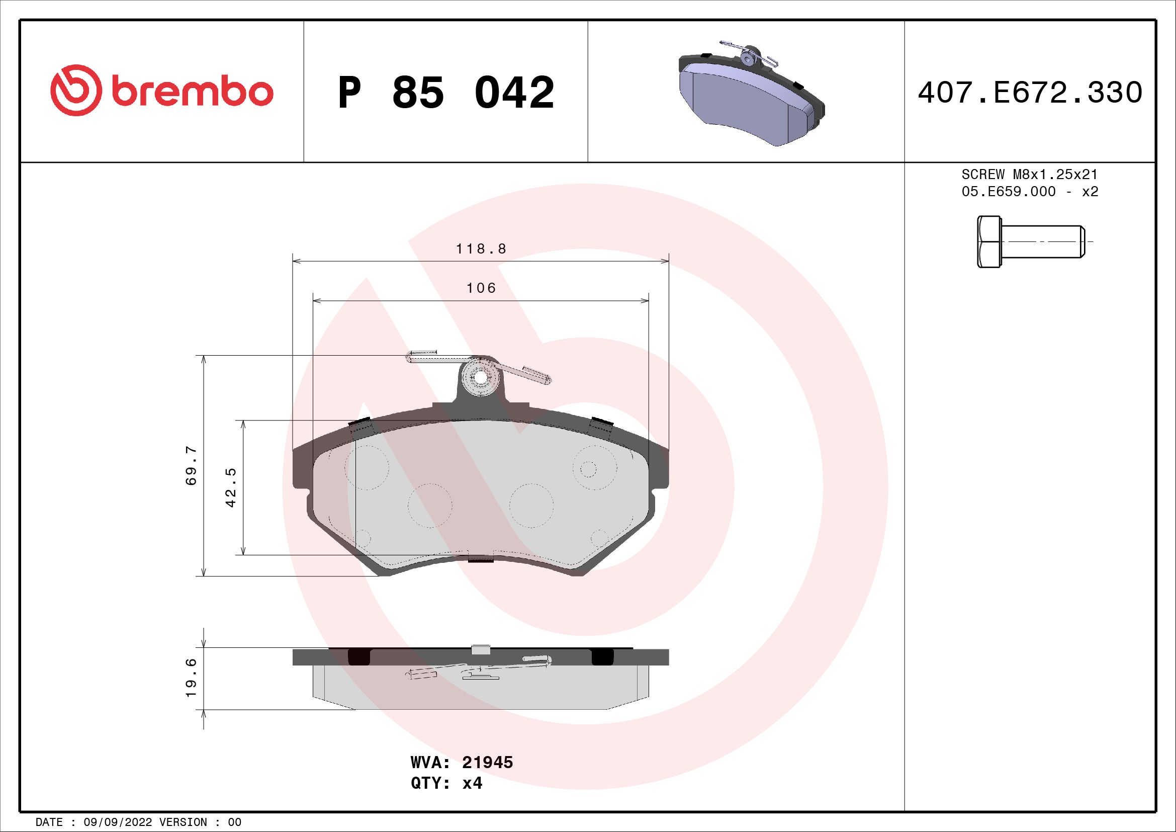 BREMBO P85042 | Fren Balatası Ön Kablosuz (VW Passat 88-00 Audi A4 95-00) (Fren balata seti, diskli fren)
